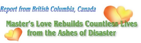 After assessing the situation, local initiates went to Vancouver, where they rented and filled a large truck with relief materials before returning to Kamloops to contact the evacuees staying at the various motels in the area. Then each individual or family received a parcel containing food, drinks, fruit and a sample booklet, and all were very happy to receive this loving support from Master. Next, the work team tried to reach those in the greatest need; namely, families that had lost their homes and that were not covered by insurance. The initiates found that by dropping their preconceived ideas and letting Master guide them, they could readily find these people.