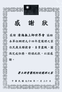 Certificate of Appreciation from the Chief Warden of the Tainan Mingde Labor Prison to The Supreme Master Ching Hai International Association for its educational and counseling work with inmates